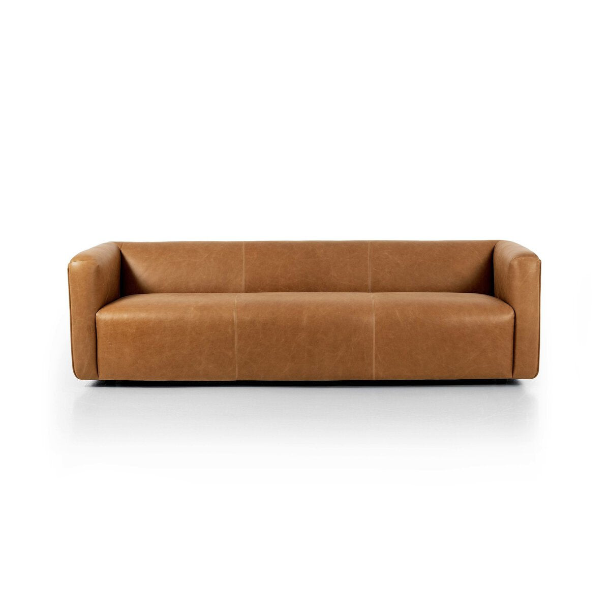 Inspired by vintage '70s seating and plush duvet toppers, this structured, supportive sofa is covered in a subtly distressed thick-cut leather.