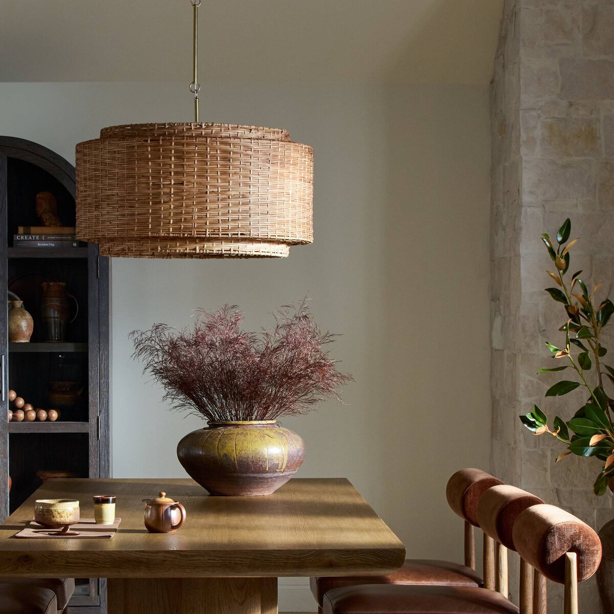 Overall Dimensions 30.00"w x 30.00"d x 16.00"hItem Number 238694-001Colors Antique Brass Iron, Natural Woven CaneMaterials Iron, CaneWeight 22.80 lbVolume 16.77 cu ftAdjustable Light, Overall Height (Max) 93.00"Adjustable Light, Overall Height (Min) 21.00"Cord Length 120.00"Mounting Plate Diameter 5.00"Mounting Plate Height 1.00"Pendant Body Diameter 30.00"Pendant Body Height 16.00"Pipe Length 1 18.00"Pipe Length 2 12.00"Pipe Length 3 6.00"Adjustable YesBathroom Safe NoBulb Type LEDCan Hang On Sloped Ceiling YesCord Type SPT-2Environmental Rating Dry RatedMax Wattage 6.00Pipe Length Qty 2-12'' x 2-6''Pipe Length Qty 2-18'' Plug Type HardwiredShade Shape DrumShape Type RoundSocket Qty 4.00Socket Type E12: SOCKETSocket Type TYPE BSuite WendallSwitch Type HARDWIRED (NO SWITCH)