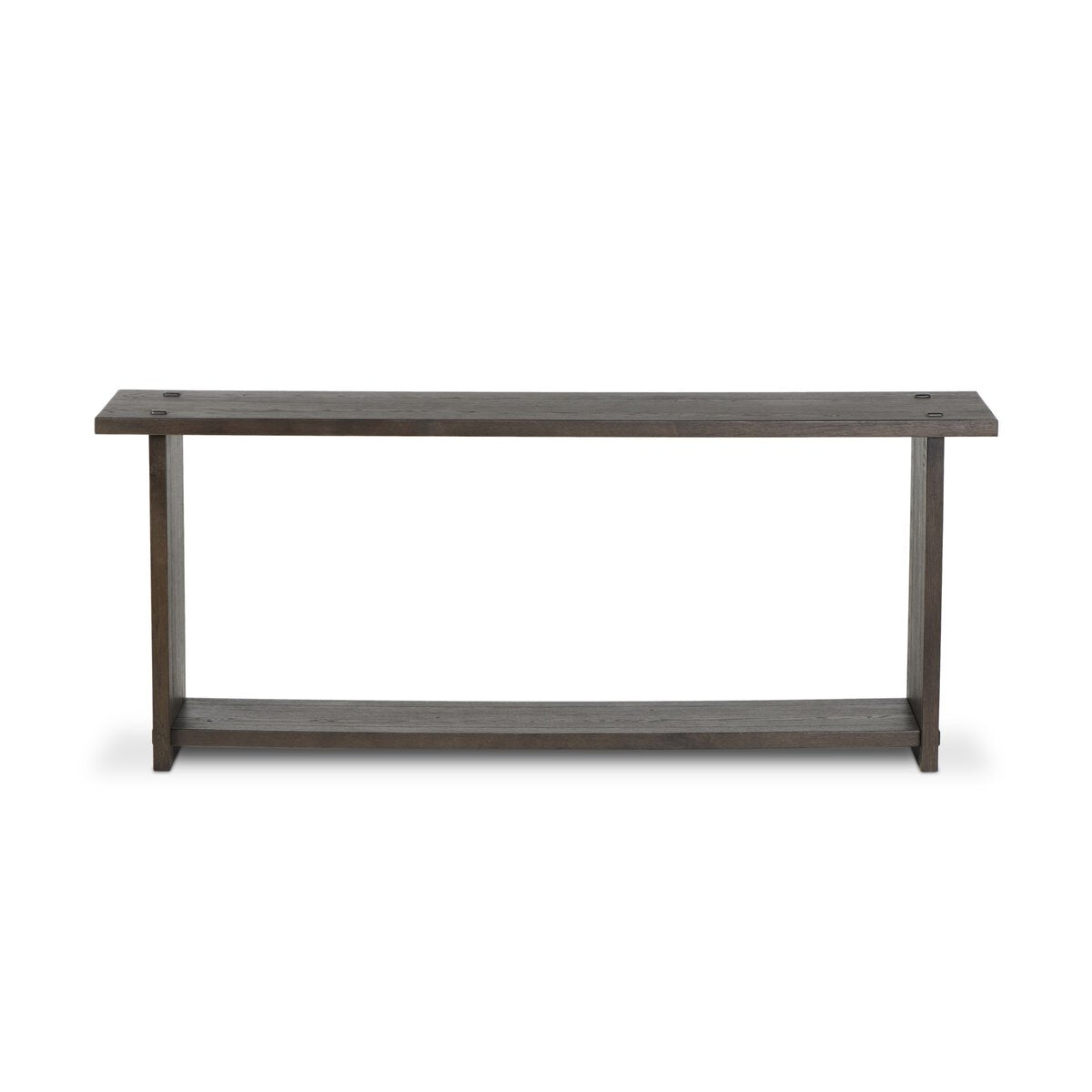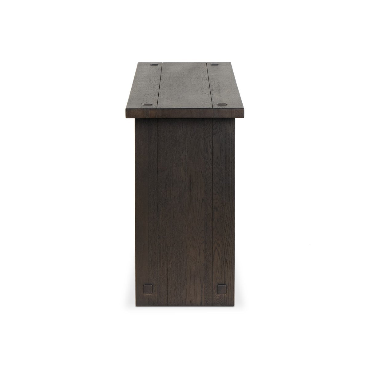 Simply shaped, material driven. Made from distressed, light-finished oak, with natural knots and graining, a paneled console table features pull-through joinery. Lower shelving brings bonus storage to your living space. A design collaboration by Amber Lewis and Four Hands. This item has limited online distribution and may not be sold on websites without prior approval. Visit the FAQ page in our Help Center for more details.